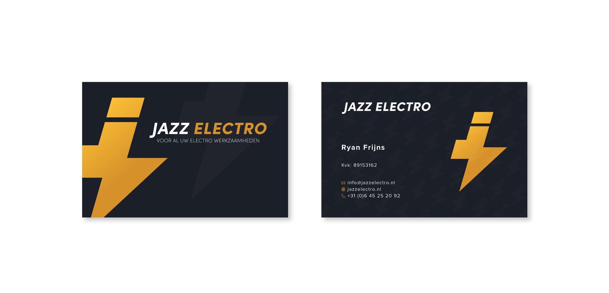 Subtiel logopatroon op zwart kaartje voor technische brandingVisitekaartjes met professionele huisstijl voor elektrotechniekbedrijf