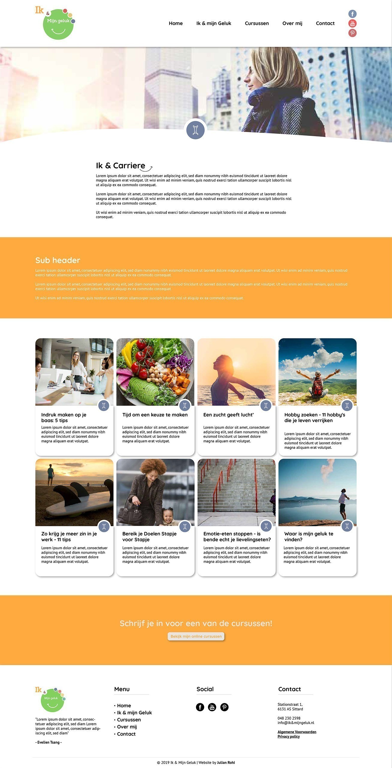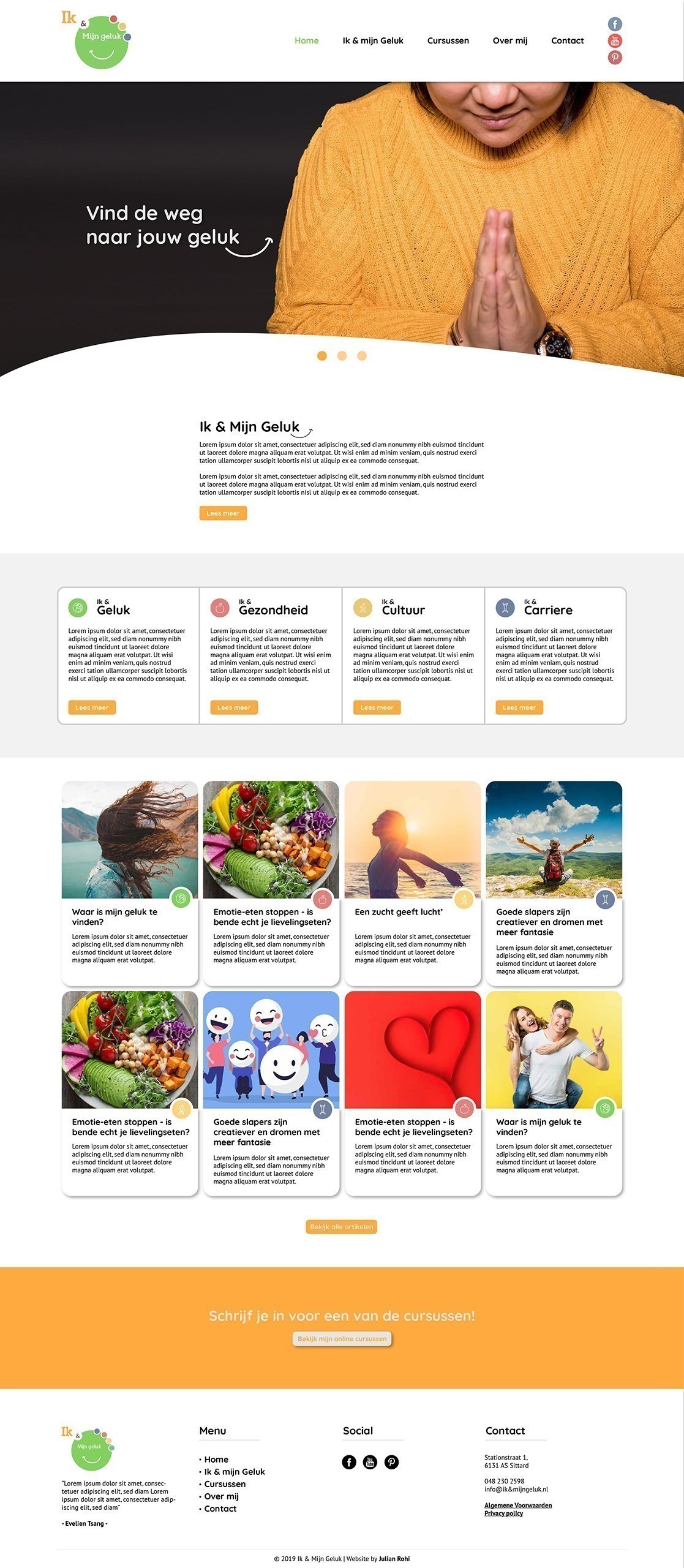 Na het logo heb ik het webdesign ontwikkeld. De website is ontworpen met een focus op eenvoud en gebruiksvriendelijkheid. Zachte kleuren, veel witruimte en een kalme sfeer zorgen ervoor dat bezoekers zich op hun gemak voelen. Dankzij de intuïtieve navigatie kunnen ze snel de informatie vinden die ze zoeken, of het nu gaat om blogs, workshops of andere resources. De site is geoptimaliseerd voor zowel desktop- als mobielgebruik, zodat het platform toegankelijk is voor iedereen, ongeacht het apparaat dat wordt gebruikt. Het resultaat is een sterke visuele identiteit die de kernwaarden van Ik & Mijn Geluk weerspiegelt: rust, balans en toegankelijkheid. De website is niet alleen visueel aantrekkelijk, maar ondersteunt ook het merkverhaal door middel van een intuïtieve gebruikerservaring en een design dat de boodschap van welzijn versterkt.