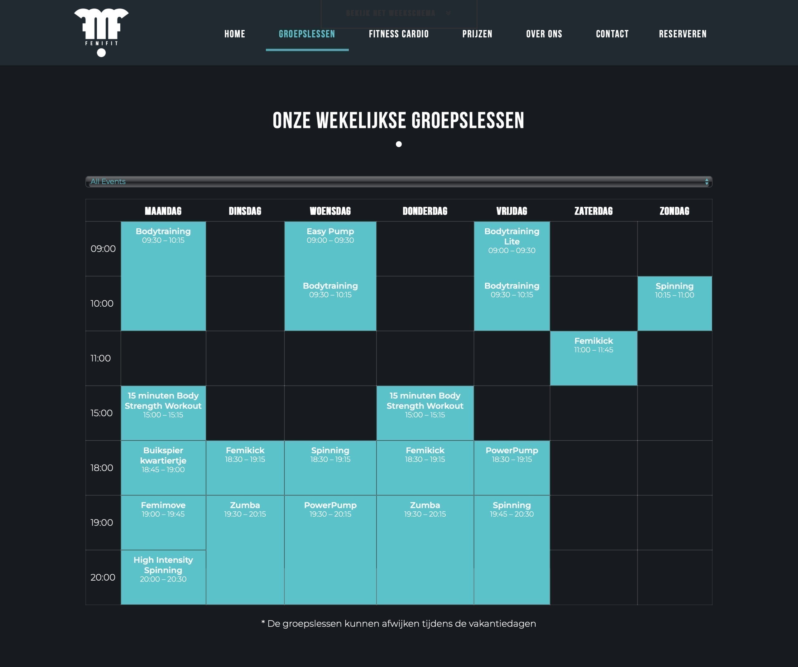 De WordPress website bevat een op maat gemaakte groepslessenpagina, waarmee bezoekers eenvoudig kunnen zien welke lessen op welke dag en tijd plaatsvinden. Het schema is overzichtelijk vormgegeven en werkt goed op desktop én mobiel. Zo hebben bezoekers altijd en overal snel inzicht in het actuele aanbod.